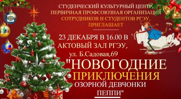 23 декабря, в актовом зале ФГБОУ ВО "РГЭУ (РИНХ)", дети членов Профсоюза Октябрьского района побывали на новогоднем представлении «Новогодние приключения озорной девчонки Пеппи». Новогодний праздник для детей был организован председателем Профсоюза РГЭУ Гордеевым С.Е., при поддержке областной организации Профсоюза. Дети и взрослые получили массу приятных впечатлений, праздничных эмоций, были в восторге от представления.